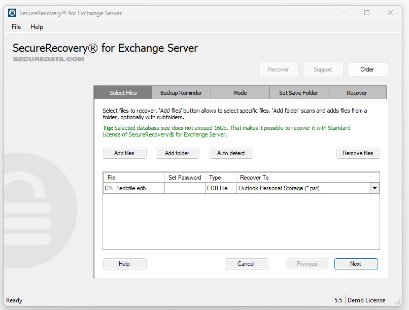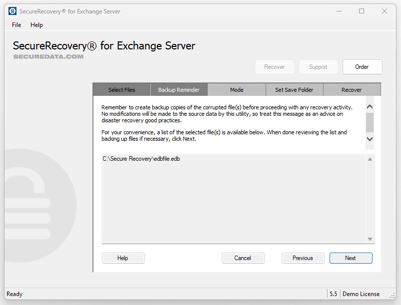 To determine whether this software will work for you, download the free demo. The demo output will provide you with a list of recoverable items, and you can decide whether to purchase the full version. Remember to back up your Exchange Server email databases before attempting to use either the full version or the demo version of SecureRecovery for Exchange Server.