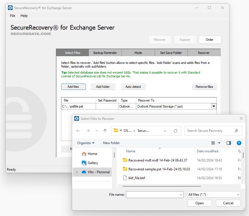 If you are recovering personal mailboxes, SecureRecovery for Exchange Server creates several folders -- one per mail user -- and stores the personal mail in a standard .PST file. However, if the recovered .PST file exceeds the 1.5 gigabyte limit, it will be split into independent .PST files named subsequently (for example, admin.pst, admin1.pst, admin2.pst and so on).