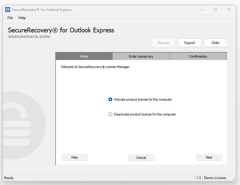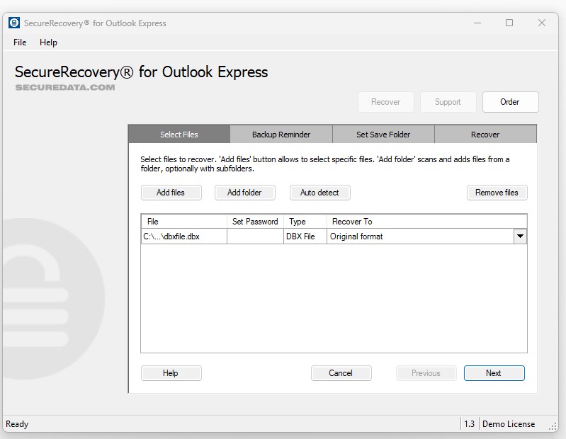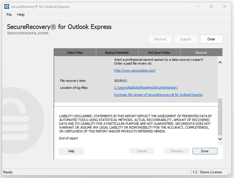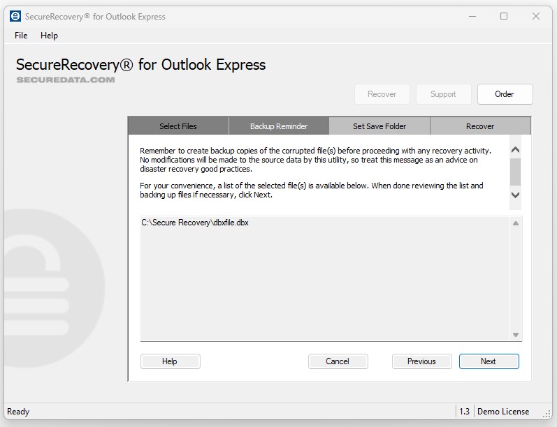 Before committing to the full version of SecureRecovery for Outlook Express, you can download the demo for free. The demo software presents a full and accurate representation of the data the utility will recover. While it labels most recoverable messages with demo text, it will also completely restore a few emails from your mailbox, displaying the repair tool’s full capability.