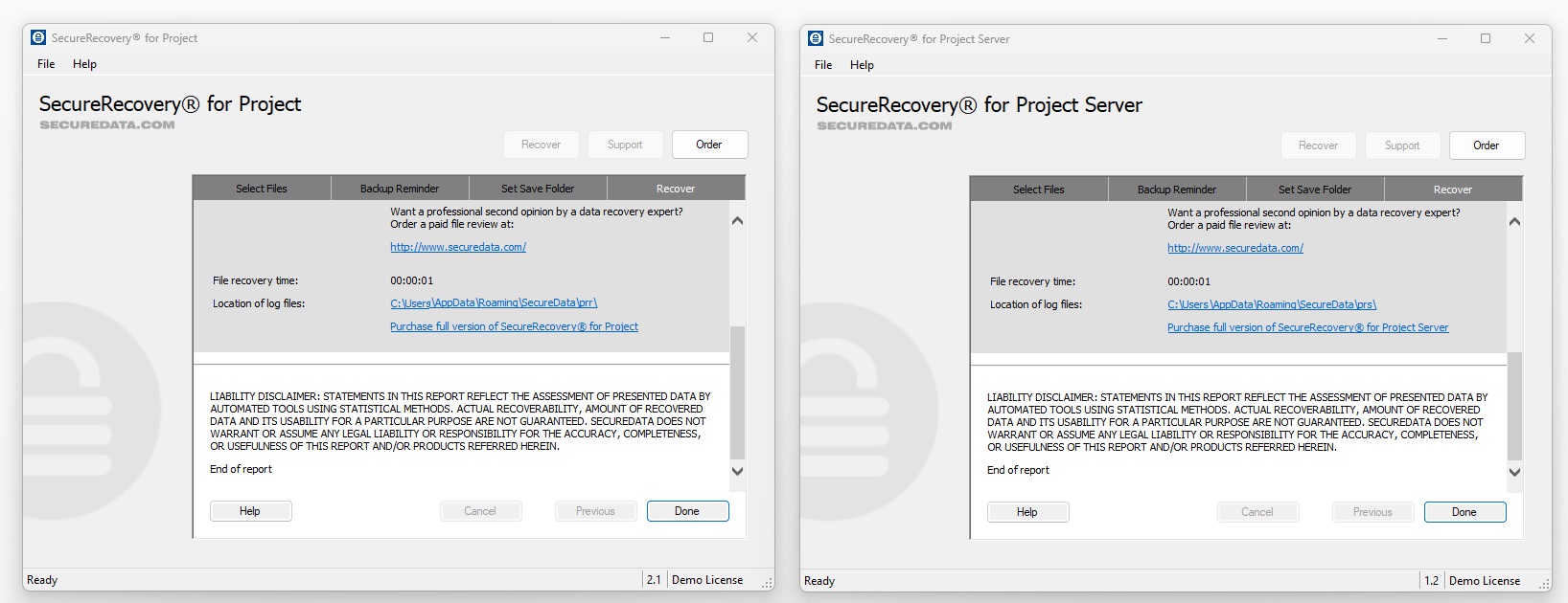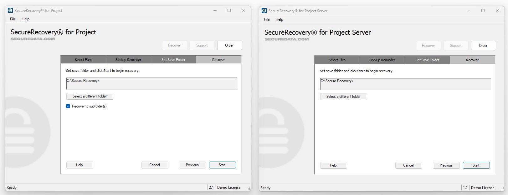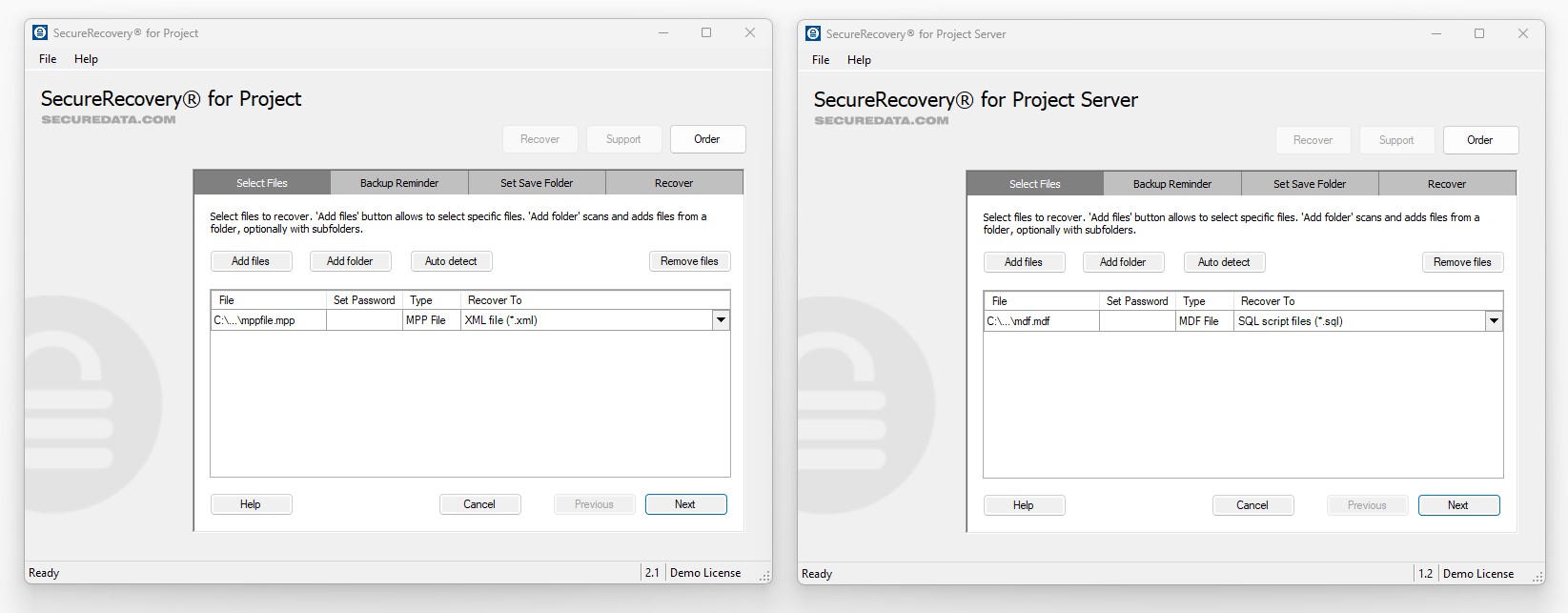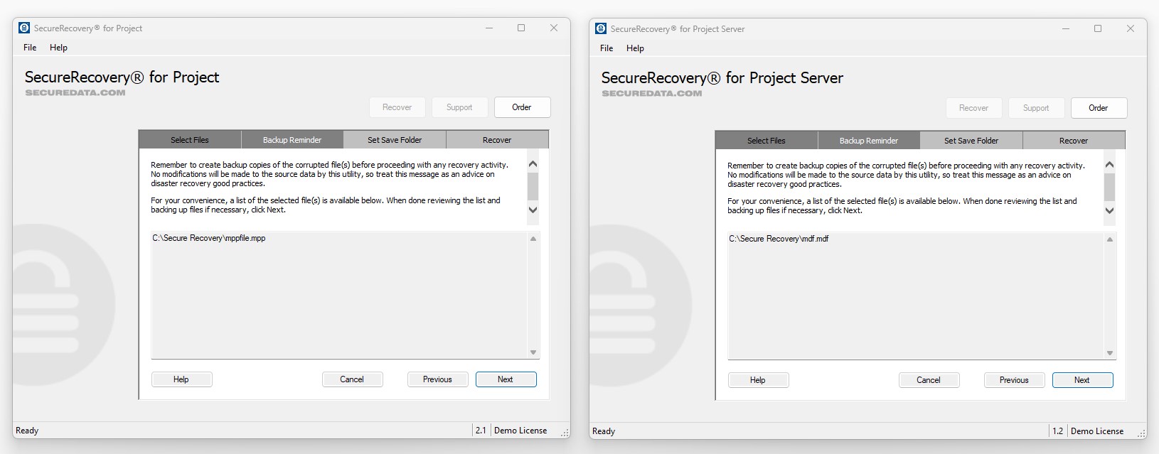 Installing and running the demo will help you understand the features of SecureRecovery for Project, and because the demo version is extremely similar to the commercial version, you can safely use it to determine whether your full database will be recoverable.