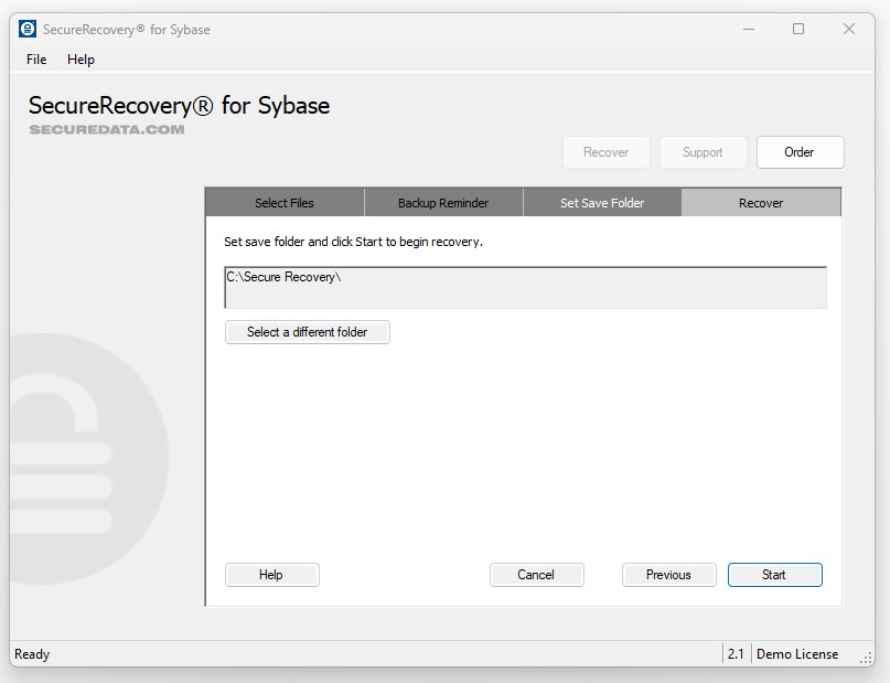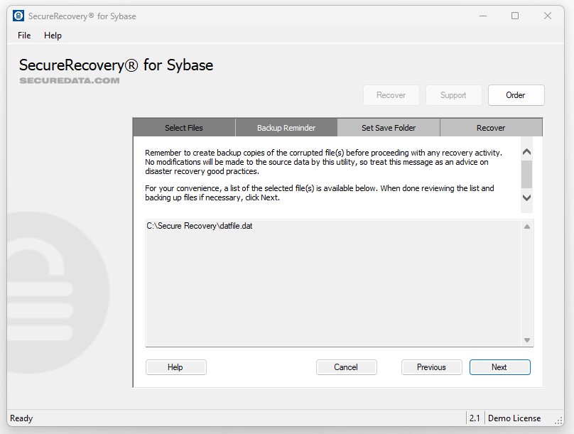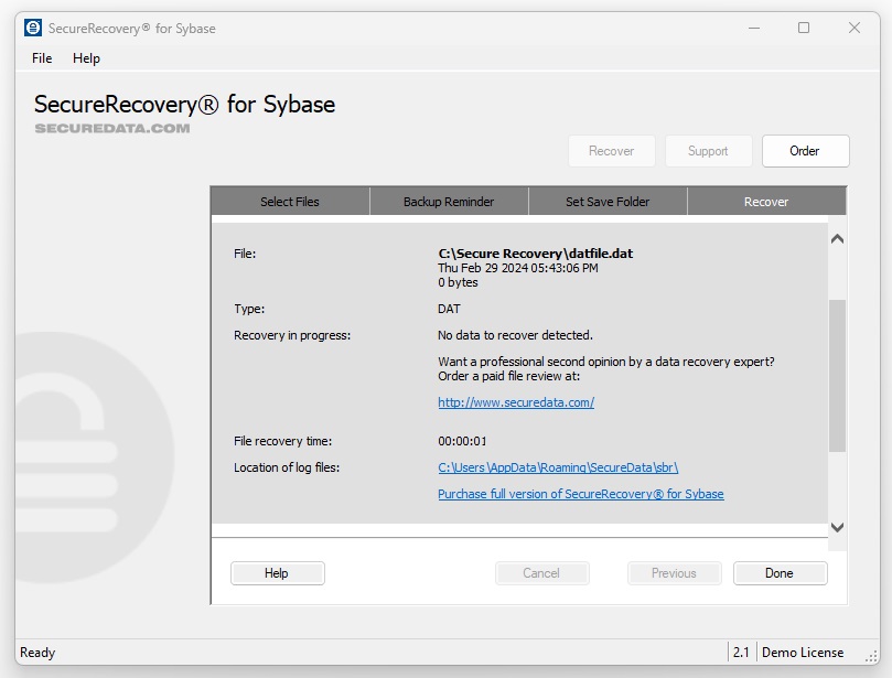 Instead of relying on guesswork or anecdotal recommendations, you can see exactly what the full version of SecureRecovery® for Sybase can recover before you buy. The free, downloadable demo displays demo text in all recoverable fields, and even fully restores a few sample rows from each table. Download the demo today to see what SecureRecovery for Sybase can do for your files.