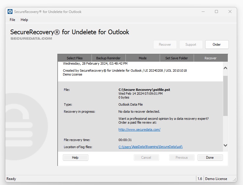 All of the commercial versions of SecureUndelete for Outlook are free from these limitations. If a letter does not appear in the demo output, it will not be recoverable with the full-featured version of the software, so please review the demo output carefully.