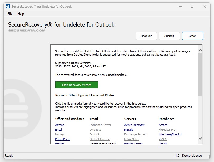 SecureUndelete for Outlook is a great choice for restoring deleted Outlook files, but if a mailbox is corrupted or damaged, this software is not sufficient on its own. When data corruption damages your Outlook files, try SecureRecovery for Outlook instead.