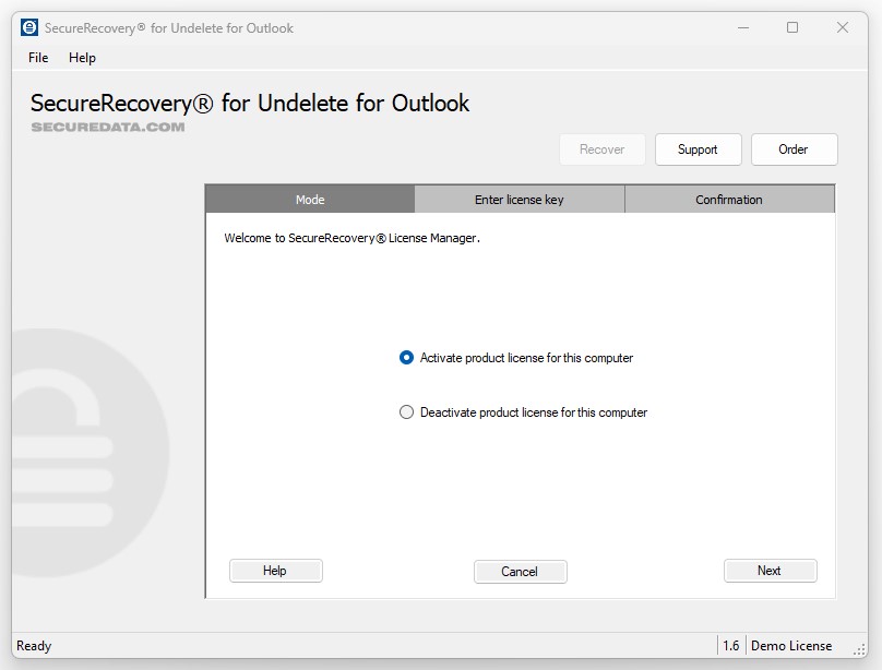 A powerful demo version of SecureUndelete for Outlook is available for download. The demo displays all the data that the full version of the software will recover. It restores three emails from each deleted mailbox, marking all other recoverable data with demo text.