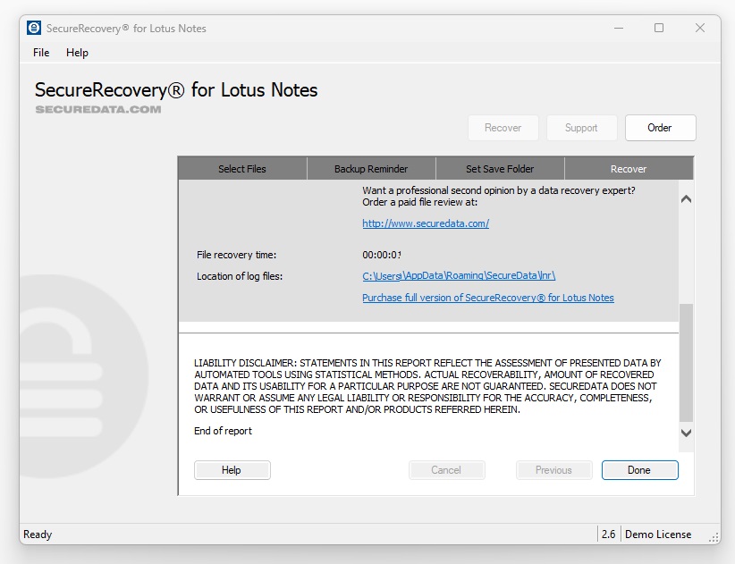 SecureRecovery for Lotus Notes is a safe, effective and secure way to restore Lotus Notes files. While success rates are high overall, the program’s results can vary from one case to the next depending on various factors, including the size of the affected files and the location of file corruption.